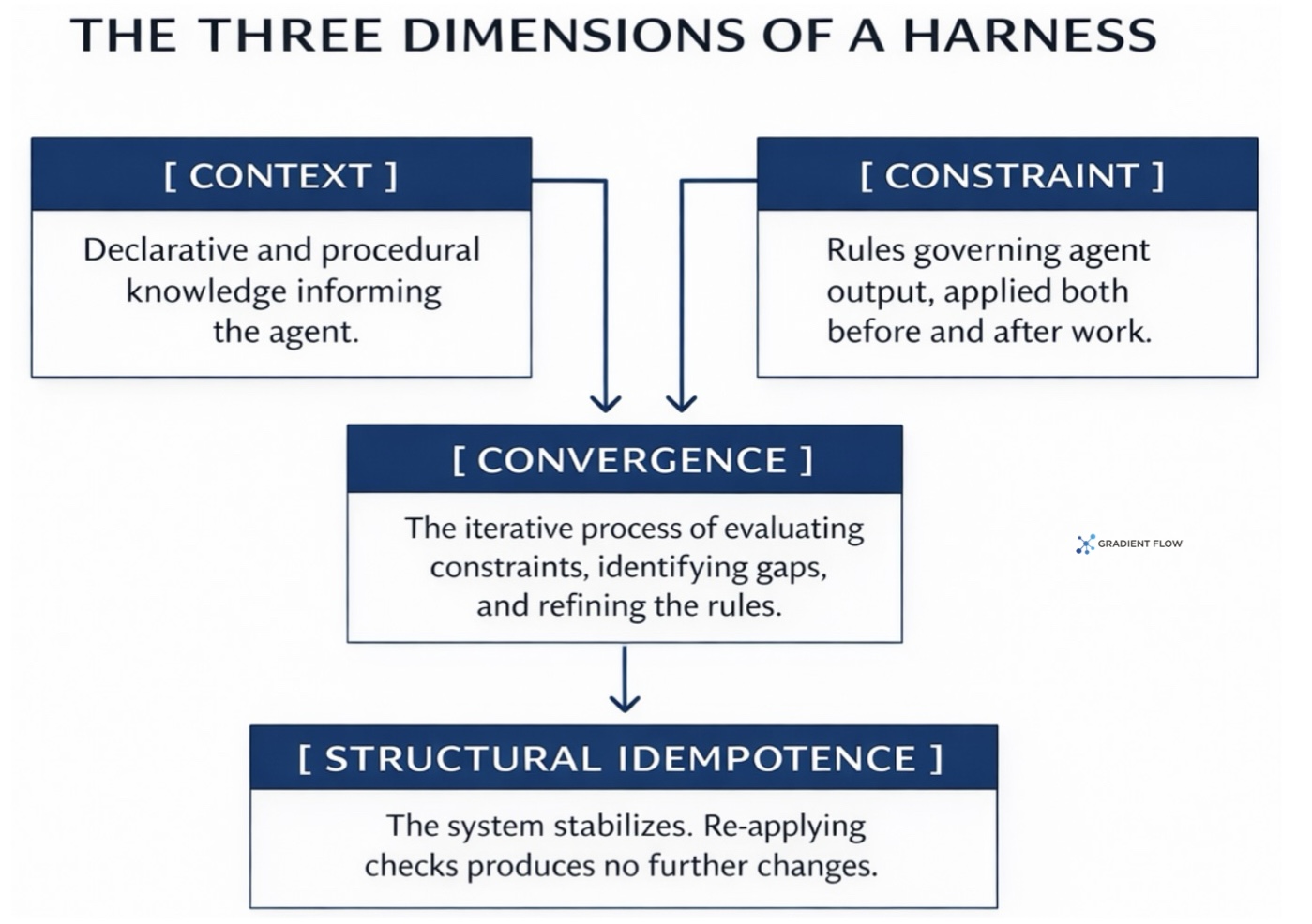 The formal framing organizes a harness along three dimensions. Context covers the declarative and procedural knowledge that informs the agent. Constraint covers the rules governing agent output both before and after it is produced. Convergence is the iterative process by which constraints are evaluated, gaps identified, and rules refined until the harness reaches what practitioners call structural idempotence, the point at which re-applying the checks produces no further changes. The system has stabilized.