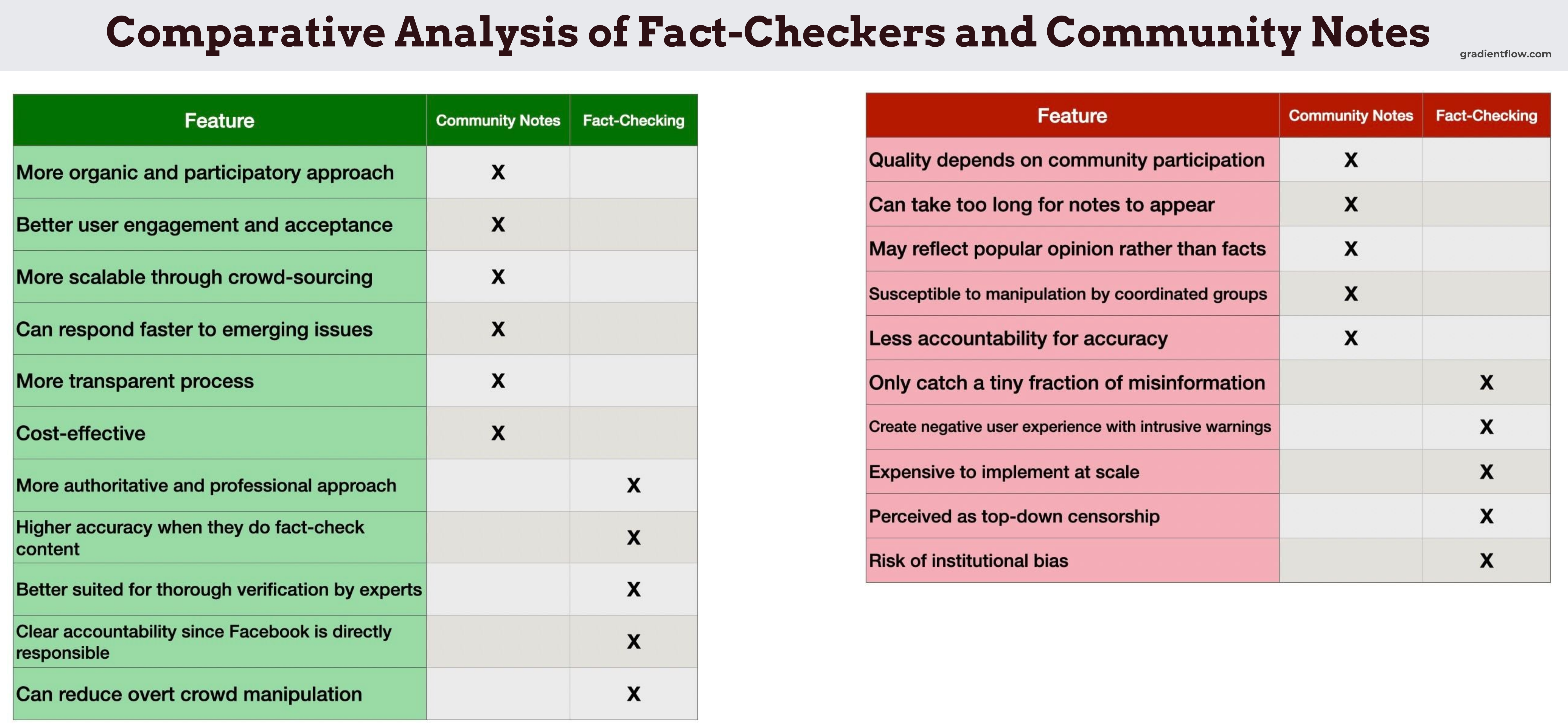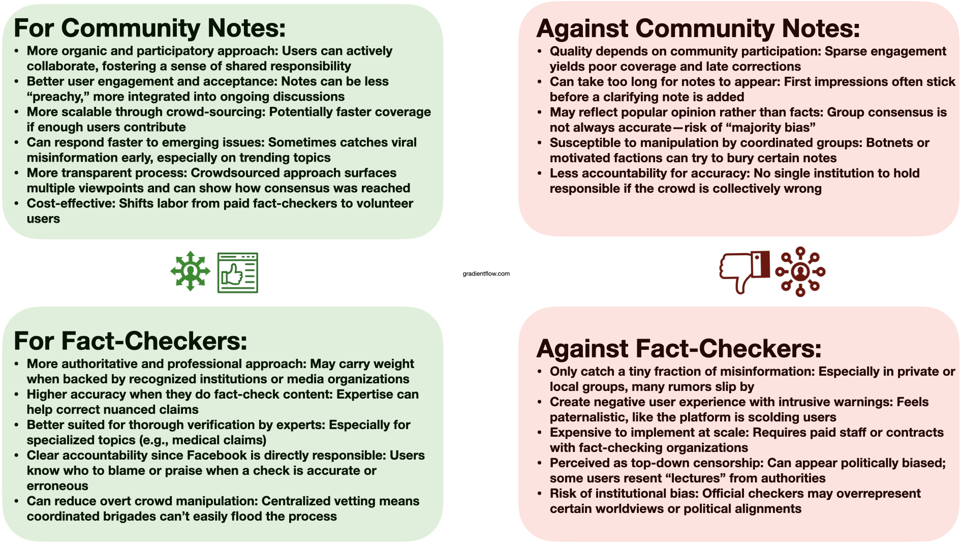 This post aims to provide a balanced analysis of these changes, exploring the strengths and weaknesses of both fact-checkers and community notes, rather than advocating for one over the other. While Meta positions these changes as a move towards broader participation in fact-checking and greater user autonomy over their feeds, skeptics express concerns that crowd-sourced notes could be vulnerable to popularity contests or orchestrated manipulation. Some observers welcome the new approach, while others argue that Facebook’s professional fact-checkers offer a more reliable framework, owing to their clear accountability and trained expertise. However, as the overview below explains, neither a top-down nor a community-driven strategy can fully resolve misinformation on its own, each presenting unique benefits and drawbacks.