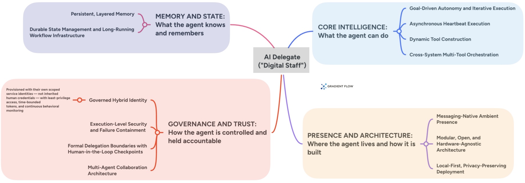 An AI Delegate (often functioning as ‘Digital Staff’) is built on the four core pillars of Intelligence, Memory, Architecture, and Governance, and is defined by the following key features: